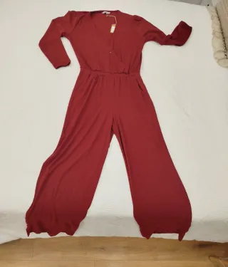 Mono largo de color burdeos con manga larga y escote cruzado. - Cintura elástica. - Piernas anchas. - Bolsillos laterales. - Medidas SIN estirar: cintura 36. Sisa 50. Largo 154. Desde cintura 105