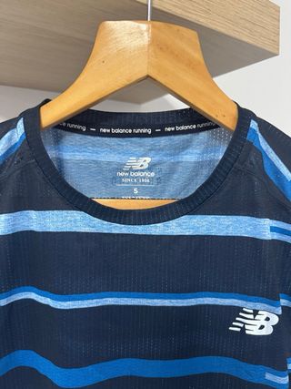 Camiseta de entrenamiento New Balance con un diseño de rayas. - Diseño de rayas en tonos azules y negros. - Tejido ligero y muy transpirable.