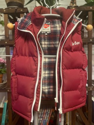 Chaleco acolchado de la marca Lee Cooper en color rojo oscuro/granate. Cuenta con capucha fija, cierre de cremallera frontal completa y el logotipo de la marca bordado en el pecho. El interior tiene un forro clásico con patrón de cuadros. Es una prenda ligera pero abrigada, ideal para el entretiempo.
