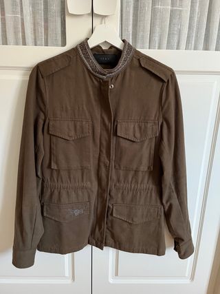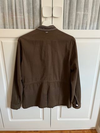Chaqueta de la marca Bershka, con un bonito color verde militar. Es una prenda sin estrenar, ideal para añadir a tu armario. - Forro interior de borreguito muy suave y desmontable - Capucha con pelo sintético desmontable - Cierre de cremallera y botones a presión. -Talla S amplia