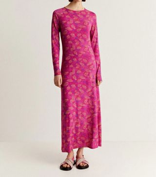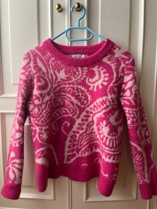 Jersey de lana y mohair estampado fucsia y blanco marca Salsa Jeans. Talla S Largo: 56 cm Pecho: 47 cm Hombros: 39 cm Largo mangas: 54 cm - Diseño de cachemir en fucsia y blanco. - Cuello redondo. - Manga larga.