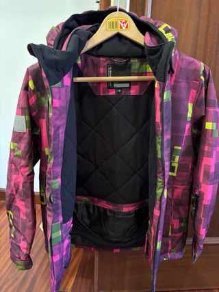 Chaqueta de nieve con un diseño llamativo y moderno. - Estampado geométrico en tonos vibrantes. - Capucha integrada. - Cremallera frontal. -Talla 12 amplia -Gorro desmontable -Prácticamente nueva
