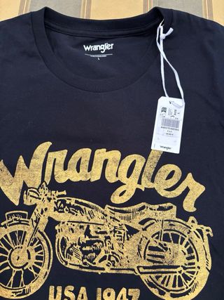 Camiseta de caballero de la marca Wrangler, con un diseño gráfico llamativo. - Estampado delantero con motocicleta y texto USA 1947. - Cuello redondo. - Sin estrenar, con etiqueta.