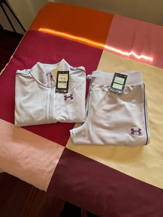 Conjunto de chándal de la marca Under Armour, sin estrenar. Ideal para un look deportivo y cómodo. - Chaqueta con cremallera completa. - Pantalón con cintura elástica. -Bolsillos en la chaqueta como en el pantalón. -De cintura 38 cm -Largo 96 cm -Original