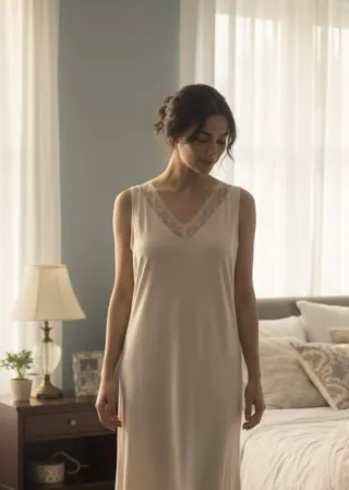 Conjunto de lencería de mujer. - Encaje delicado en el corpiño. - Falda larga y vaporosa. - Detalle de volantes en el bajo.