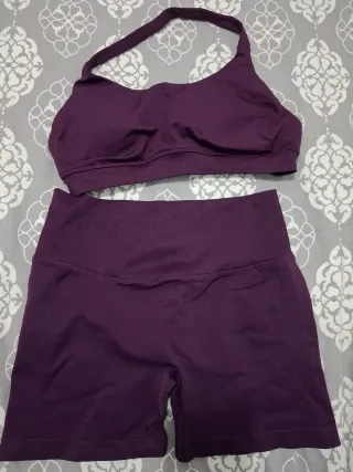 Conjunto deportivo de dos piezas. - Sujetador deportivo con tirante halter. - Shorts de cintura alta.