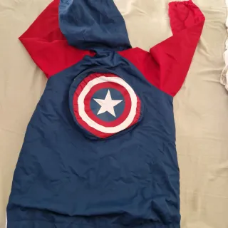 Chubasquero infantil con diseño inspirado en el Capitán América. - Capucha integrada. - Cierre de cremallera. - Mangas largas con puños elásticos. - Detalle del escudo del Capitán América en el pecho. Con bolsillo en la españda para guardarlo, original comprado en fisney , con estiqueta, talla grande