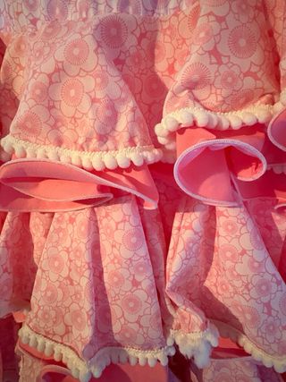 Traje de flamenca rosa con estampado floral, ideal para fiestas y eventos. - Diseño con volantes. - Mangas con volantes. - Adornos de encaje blanco.
