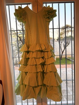 Traje de flamenca amarillo con estampado. - Mangas con volantes. - Falda con varios volantes en cascada. - Hecho a mano