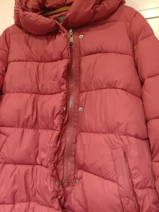 Elegante chaquetón acolchado con un bonito tono rosa maquillaje. Perfecto para mantenerte abrigada con estilo. - Diseño acolchado de plumas. - Capucha integrada. - Doble cierre con cremallera y botones a presión. - Puños ajustables con cordón y puño de algodón. - Bolsillos laterales con cremallera. - Muy calentito y color favorecedor. - Talla M grande, más bien una L.