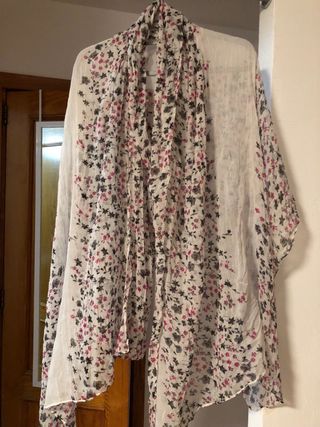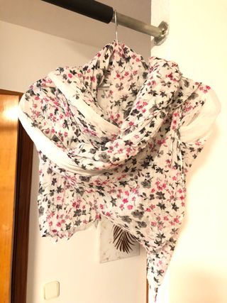 Pañuelo grande de flores, con tejido parecido a la gasa, transparente. Tamaño aproximado 1,30 x 1,80m. Tiene algún enganchón, pero al ser tan grande se tapa sin problema.