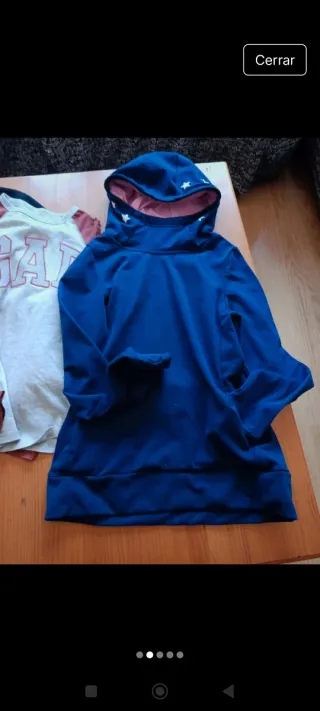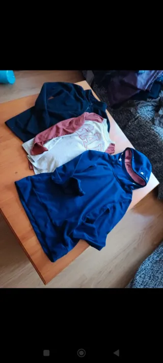 Oportunidad: lote prendas de ropa en talla S/M. Prácticamente nuevas, porque fueron regalos. - Sudadera azul marino con estrellas rojas. - Chaqueta vaquera. - Jersey gris. Doble cara - Chaqueta deportiva granate. Llévate las cuatro por el precio de casi una.