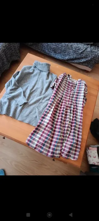 Conjunto de ropa para chica en talla M/L. Las prendas dicen talla L pero más parecen una m - Jersey de cuello alto gris. Lana - blusón largo a cuadros multicolor. Que se pueden recoger los lados en dos tiempos en las mangas son tres cuartos y también se pueden recoger
