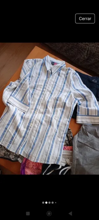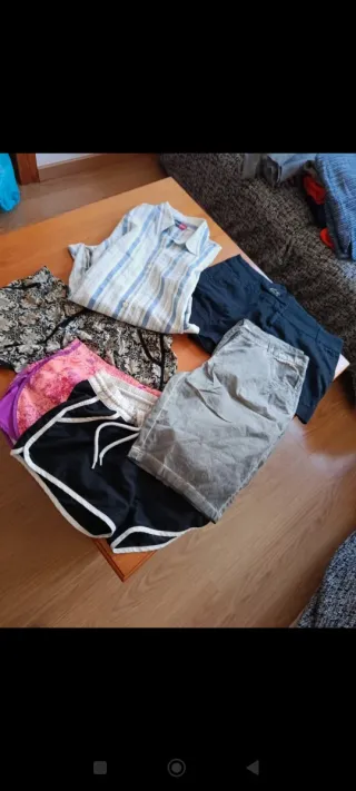 Lote de ropa para chica en talla XL. - Camisa a rayas blancas y azules. - Pantalón corto negro y blanco - Pantalón corto gris en .tela mojada - Pantalón corto con estampado floral - bañador rosa y morado. -Pantalón corto negro . La mitad de las prendas con poco uso y otros en buena condición.