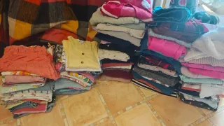 Conjunto de ropa para niña. Hay desde la talla 9-10(ancha) 12-13-14 Habrá unos 30 pantalones de vestir,de chandal y de deporte vestidos de lana ,otra chaqueta vaquera con borrego por de trontro ,sudaderas polares 11-12 y alguna de 12-13,ropa de verano también hay ,se vende todo completo ,no separo ropa. Se vende completo todo. Hay que darle un lavado ya que aunque estaba estaba guardado en bolsas herméticas cogen polvillo. Urge su venta.