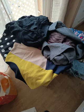 Tengo tres cajas de ropa de chica incluyen pantalones,vestidos,camisas , chaquetas,de todo un poco.De varias marcas y tallas de 36 a 42 o 44. - Prenda con estampado de lunares blancos sobre fondo negro. - Blusa negra con detalles fruncidos. gabardina en beige etc etc... La chaqueta gris es de Adolfo Domínguez de la talla 36 y es de paño .Casi todas las prendas que están en mi perfil van en las cajas.La falda de paño va con la chaqueta de Adolfo Domínguez.