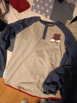 Conjunto de varias prendas de ropa para chico. - Chaqueta azul cortaviento - Pantalón gris. - Camiseta gris con mangas negras. - Camiseta converse gris con botones y detalles rojos.