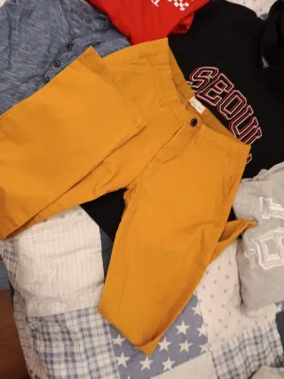 Conjunto de ropa infantil en talla S - Camiseta roja estampado(.regalo) - Sudadera polar negra con bolsillo - sudadera polar gris con diseño. - Pantalón unit boys, mostaza tacto suave. - Camisa azul.