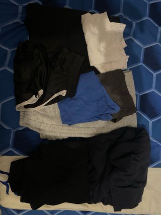 Lote de ropa deportiva para hombre, ideal para entrenamientos o uso casual. - Pantalones de chándal grises,primark. XXL - Pantalones de chándal negros,primark. XXL - Pantalones cortos negros,tex. XXL - Camiseta azul tirantes,gold gym . XXL -Camiseta negra tirantes,gold gym. XXL - Sudadera azul marino con capucha primark. XXL - Sudadera negra sin capucha primark. XL -Camiseta dragón ball,primark. XXL Todo por solo 10 euros !!!