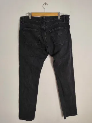 Pantalones vaqueros de corte recto en color negro. - Cintura con trabillas para cinturón. - Cierre de cremallera y botón. - Bolsillos delanteros y traseros.