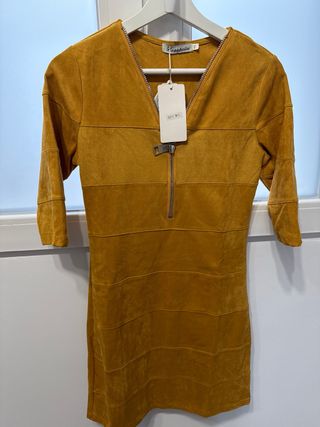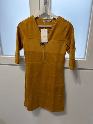 Vestido ajustado de tela tipo pana en color mostaza. Ideal para cualquier ocasión. - Diseño con cremallera frontal. - Manga tres cuartos. - Corte ceñido. - Sin estrenar