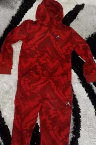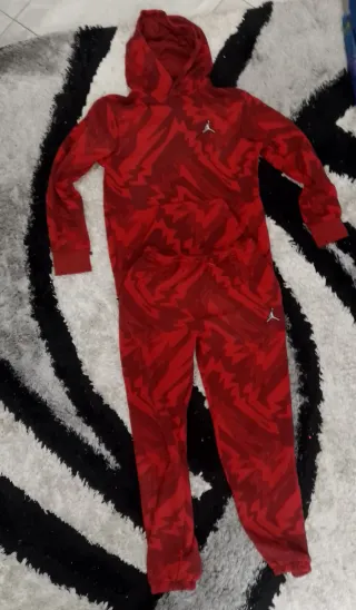 Conjunto de chándal Jordan con un llamativo estampado. - Sudadera con capucha. - Pantalón a juego. - Diseño en tonos rojos.