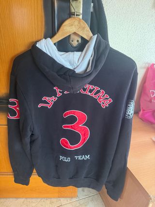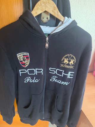 Chaqueta deportiva negra con detalles de Porsche y La Martina. talla M/L - Cierre de cremallera frontal. - Capucha. - Bolsillos delanteros.