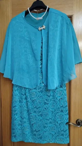 Elegante conjunto de vestido y chal en un bonito tono azul cielo. - Vestido con encaje floral. - Chal a juego con diseño de encaje. - Adornado con un broche de pedrería.