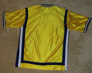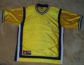 Camiseta Adidas auténtica de los 90. Color amarillo vibrante con detalles en azul navy. ✅ Talla L (Tallaje de época). ✅ Logo bordado. ✅ Muy buen estado. Perfecta para combinar con unos vaqueros anchos o pantalones de chándal. ¡Precio negociable si compras hoy!