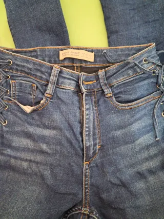 Lote de: pantalón vestir cuadros Stradivarius 36, pantalon vestir negro Mango S, pantalón polipiel Stradivarius beige 36, vaqueros elásticos Stradivarius, jersey cuello alto S Cortefiel, suéter Stradivarius calado S, camiseta verde oscuro con hombreras brillantes de Stradivarius S. Todo en perfecto estado