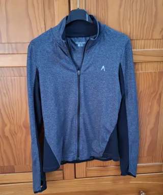 Conjunto de ropa deportiva para mujer. - Chaqueta gris con cremallera. - Pantalón negro con cintura elástica.