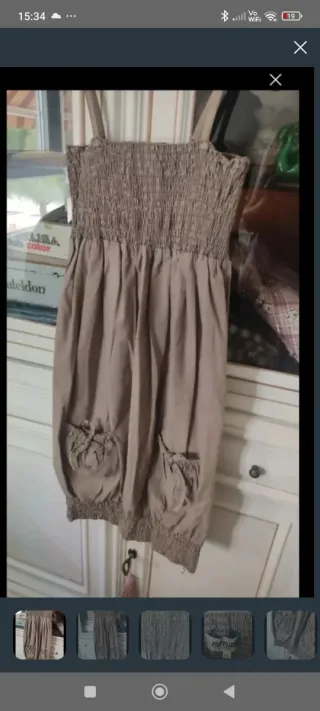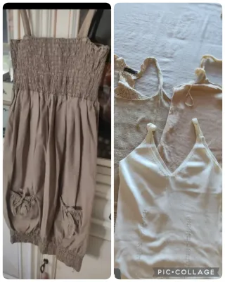Conjunto de prendas de vestir en tonos beige y blancoy verde caqui, - Vestido con escote fruncido y bolsillos. - Top de tirantes con detalle de crochet. -2Camisetas de tirantes lisa y otro cogido al cuello
