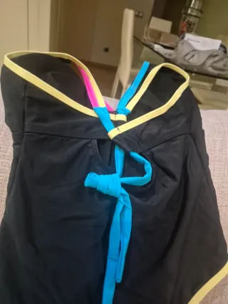 Bañador de una pieza en color negro con detalles de vivos en contraste. Es M perfecto también L - Escote en V. - Tirantes finos. - Ribete de colores en escote y pierna.