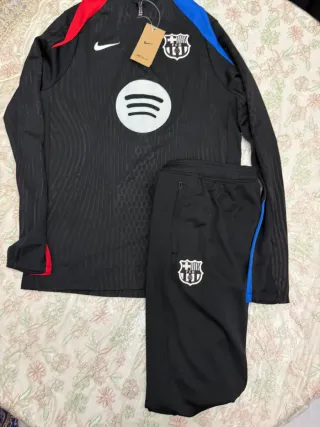 Conjunto deportivo del FC Barcelona. - Chaqueta negra con detalles en rojo y azul. - Pantalón negro con franja lateral azul. - Logos de Nike y FC Barcelona. - Diseño con estampado texturizado.