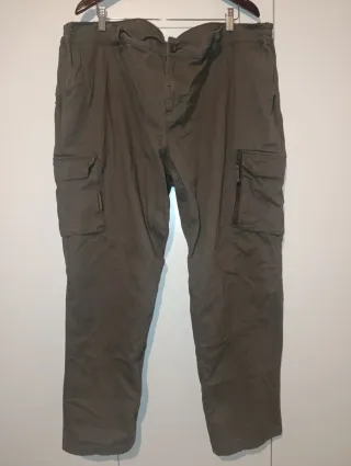 Pantalón de corte cargo en color verde oliva. Cierre de cremallera y botón. Dos bolsillos laterales en el muslo con solapa. Bolsillo adicional con cremallera en el muslo izquiedo. Dos bolsillos laterales superiores. Diseño con costuras reforzadas en las rodillas. Cintura elástica y material resistente. Medidas: 108 cms largo x 73 cms largo pierna x 61 cms ancho cintura. No tiene etiquetas (cortadas), a tenor de las medidas, equivale a una 5XL. Muy buen estado.