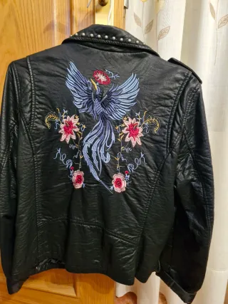 Chaqueta de polipiel con un precioso bordado de ave fénix y flores. - Diseño de ave fénix en la espalda. - Detalles florales bordados. - Adornos de tachuelas en el cuello.