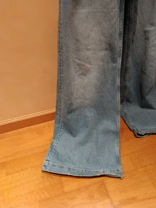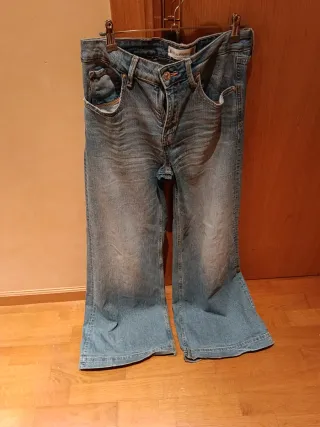 Tejanos de mujer de corte acampanado.el bajo está un poco rozado como se ve en la foto - Cintura alta. - Bolsillos delanteros y traseros. - Cierre de cremallera y botón.