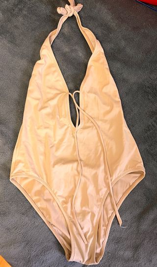 Bañador de una sola pieza con un diseño elegante y moderno. - Color nude. - Escote pronunciado con detalle de lazada. - Tirantes de cuello halter. Talla M (hasta una 40)
