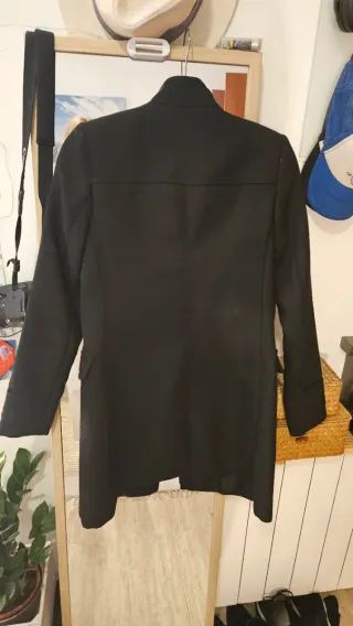 Elegante abrigo negro con un diseño clásico y detalles distintivos. Talla peque - Cierre de botones dorados. - Cuello alto. - Bolsillos frontales.