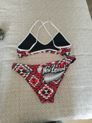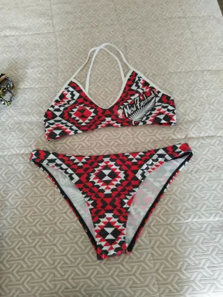 Bikini de la marca Turbo con un diseño geométrico llamativo de Nueva Zelanda. - Estampado en rojo, negro y blanco. - Tirantes blancos. - Braguita a juego.