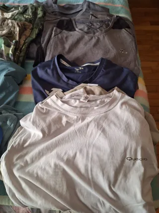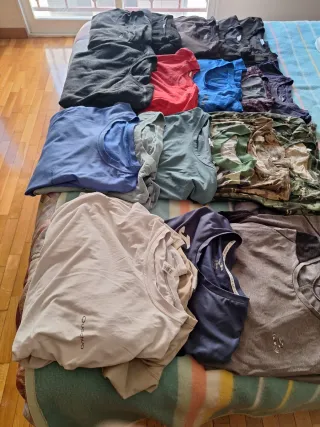Lote de varias prendas de vestir de talla XXL. Todas las prendas son de segunda mano. - Variedad de colores: beige, negro, azul, gris, verde oliva y rojo. - Talla: XXL (equivalente a 48/58).4 camisetas manga larga y17 corta 21 calcetines 12 calzoncillos 10 sin usar zapatillas n 43 ..16 cinturones