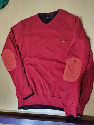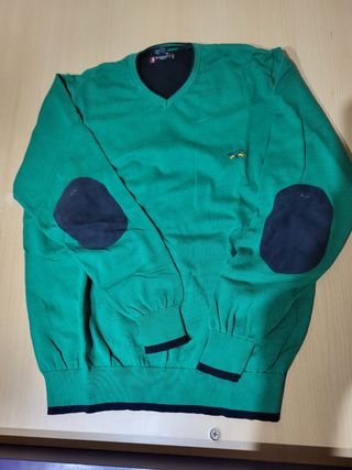 Jersey de la marca Spagnolo en color verde. Presenta un diseño clásico con coderas. - Cuello en V. - Coderas de ante en color negro. - Puños y bajo con banda elástica y detalles en negro. - Pequeño logo bordado en el pecho.