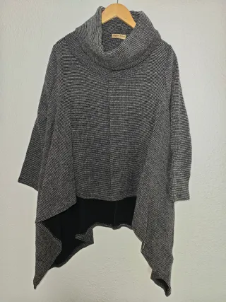 Poncho con un diseño moderno y cómodo. - Tejido texturizado con finas rayas. - Cuello alto tipo bufanda. - Corte asimétrico con bajos irregulares. - Detalle interior en contraste.