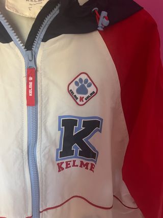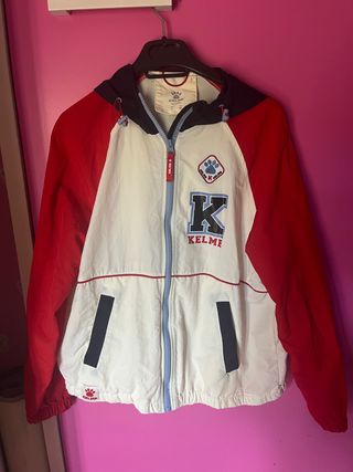 Chaqueta tipo universitaria impermeable en color rojo, blanco y azul en muy buen estado, con capucha, cremallera y bolsillos. Kelme by lefties, talla L.