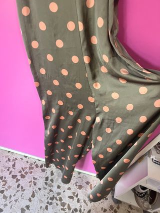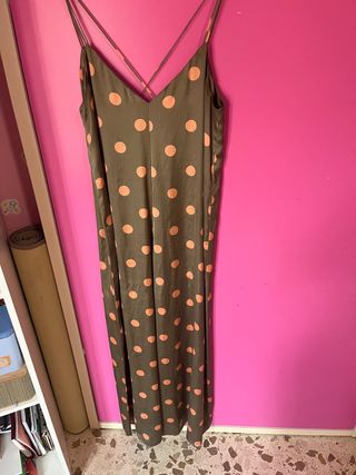 Mono largo de tirantes verde con lunares rosa, satinado. Está en perfecto estado. Zara talla M. En la tercera foto es donde mejor se aprecian los colores.