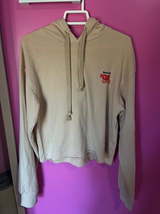 Sudadera beige con letras rojas y azules en muy buen estado, Bershka talla S.