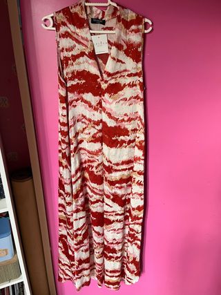Vestido largo de tirantes nuevo con la etiqueta, en rojo, rosa, blanco y toques dorados. Pipiola chic.
