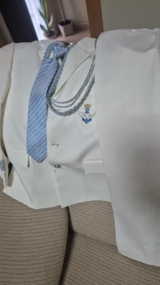 Conjunto de traje para comunión de niño. - Chaqueta blanca. - Pantalón blanco. - Corbata azul con rayas. - Adorno con ancla y alas en la solapa. - Camisa Talla 12. Tiene alguna manchita, de ahí su precio. Solo usado 1 vez