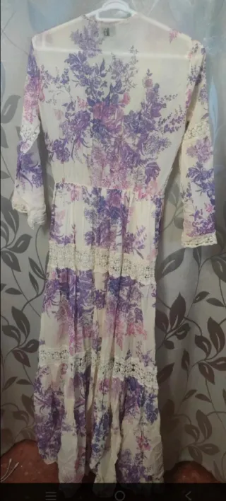 Vestido largo de la marca dixie con un estampado floral vibrante. Presenta detalles de encaje que añaden un toque bohemio y romántico. - Diseño con escote en V. - Mangas largas. - Encaje en cintura y bajo.
