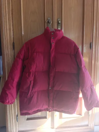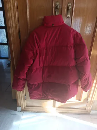 abrigo tres cuartos plumas rojo, con las mangas desmontables, se convierte en chaleco, ideal para esos días que cambia la temperatura. Capucha oculta en el cuello. Bolsillos laterales. Cierre con cremallera y corchetes. Interior de forro de tela fuerte, no de rayón, se lava muy bien. Para mucho abrigo. Pone talla 16 pero es para una M grande prácticamente L